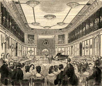 In 1842 another storey was added to the old building, and galleries provided more room for the growing audiences. The hall was redecorated, and gas lighting was substituted for the oil lamps.