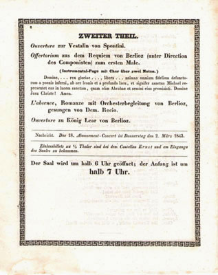 […] Here [sc. in Leipzig] I gave a concert [on 4 February] which included the King Lear overture, the Fantastic Symphony, which left them astonished rather than moved, etc. The finale (the Sabbath) was performed with a precision and diabolical fury without example. I was then asked for a few pieces for a charity concert for the poor [on 22 February] and I gave them again King Lear, a melody with orchestra [Absence, sung by Marie Recio], and the eternal Offertorium. These three pieces have definitely swept the Leipzig audience off their feet. […]