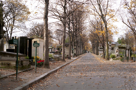 Berlioz’s tomb, covered with red and yellow flowers, is situated by the first tree on the left.