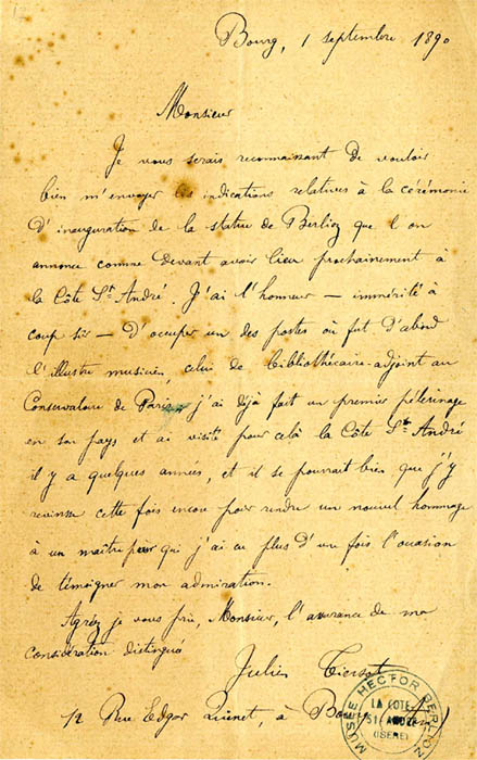 I would be most grateful if you could send me the invitations to the ceremony for the inauguration of the statue of Berlioz which is announced as due to take place soon at La Côte St André. I have the honour — surely undeserved — of occupying one of the posts formerly held by the illustrious musician, that of assistant librarian of the Conservatoire in Paris. I have already made one pilgrimage to his country and visited for this purpose La Côte St André several years ago, and I might well return on this occasion as well to pay a new homage to a master for whom I have more than once had the opportunity to manifest my admiration. I am, Sir, yours faithfully Julien Tiersot 12 Rue Edgar Quinet, at Bourg (Ain) |