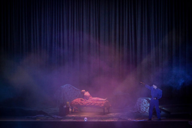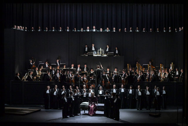 On était donc dubitatif à l’annonce d’un « opéra mis en scène » dans la programmation de saison du Théâtre des Champs-Élysées (avec non moins de cinq représentations publiques). Et le résultat ne convainc guère, quand bien même d’autres réalisations avaient parfois su trouver une note plus juste (comme naguère celle de La Fura dels Baus à Salzbourg). Ici, la metteuse en scène Silvia Costa se contente d’un pauvre canapé-lit mal éclairé avec un personnage transi (de froid ?), puis, après un entracte, mal placé à la fin de la troisième partie, le déploiement de l’orchestre (précédemment confiné dans la fosse) et des chœurs sur le plateau (peut-être en référence à la vraie vocation de l’œuvre ?) devant lesquels s’ébrouent laborieusement les solistes. Peu séduisant et peu significatif !