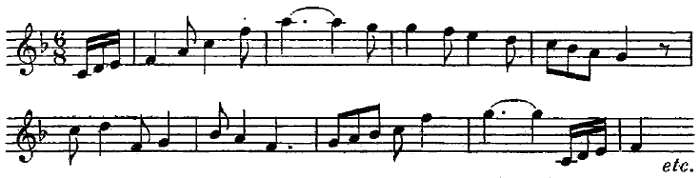 Voici maintenant un thème plus développé, donnant l’impression d’une marche militaire de l’ancien temps, avec des fifres ; il y en a trente-six mesures, écrites à l’encre : nous ne reproduisons que les huit premières, exposant le motif principal.